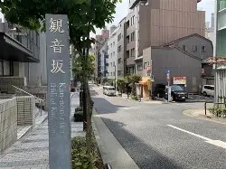 観音坂は、「本郷通り」から、全電通労働会館とホテル竜名館の間を「外堀通り」に抜ける下る坂です。寛永の頃から元禄の頃までホテル竜名館の所に茅浦観音寺があったことから呼び慣わされた坂の名です。