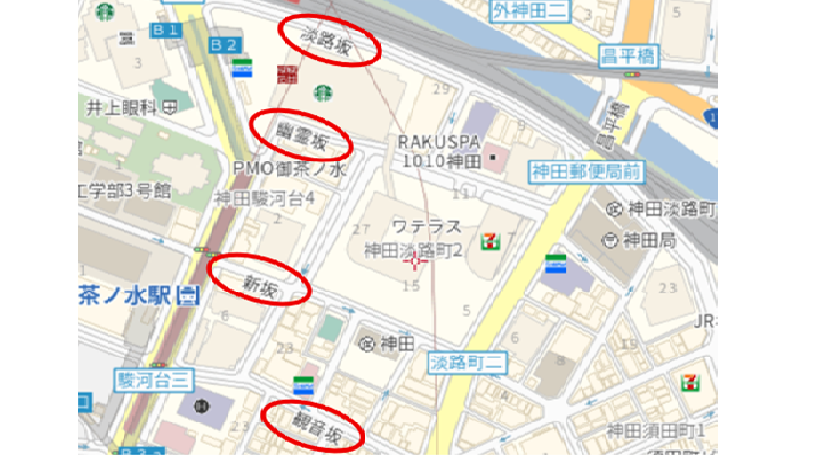 淡路町2丁目には4つの坂があります。添付地図の北側から、淡路坂、幽霊坂、新坂、観音坂です。